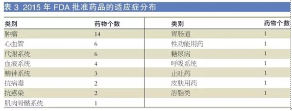 2015年FDA批准的抗肿瘤、心血管、抗感染三大类新药分别有14个、6个和2个。