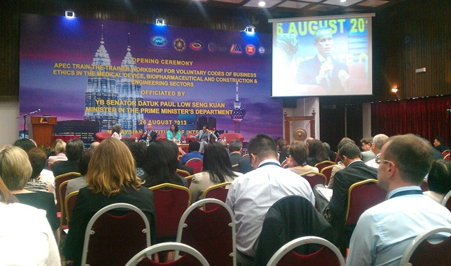 2013亚太经合组织医药产业伦理准则会议(2013 APEC Train-the-Trainer Workshop for Voluntary Codes of Business Ethics – Biopharmaceutical Sector Program)于2013年8月26-30日在马来西亚吉隆坡隆重举行。马来西亚总理Abdul Razak、总理办公室部长兼参议员Datuk Kwan、国家反贪局局长Tan Mohamed、美国商务部高级贸易顾问Lynn Costa等政府官员、以及来自20个亚太经合组织成员国的近150位代表出席了活动。