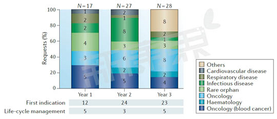 图1 2012-2015年披露资料的72个获得突破性治疗药品认定新药疾病领域分布和年代分布