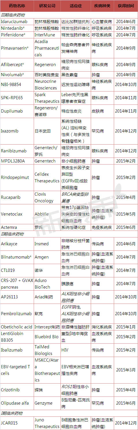 表1 2014年6月至2015年6月获得FDA突破性治疗药物认定的III期临床新药