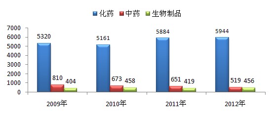 2012年,药品审评中心全年受理新注册申请6919个(以受理号计)。与既往年度受理审评任务的比较情况见图1。