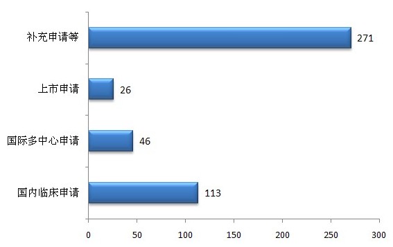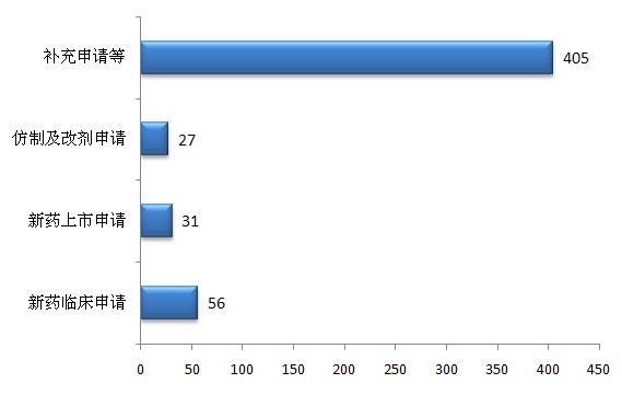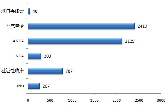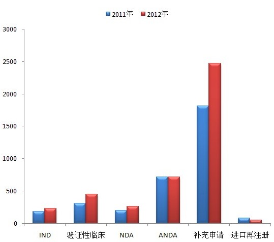 2012年,化药新申请以受理号计共5944个。其中新药临床试验申请(IND)包括注册分类1、注册分类2和国际多中心临床试验申请;验证性临床为注册分类3和4的临床试验申请;新药生产上市申请(NDA)为完成临床试验后的生产上市申请;仿制及改剂型申请(ANDA)为注册分类5和6生物等效试验申请和生产上市申请;补充申请系已上市产品的变更申请(其中,以补充申请形式提交的创新药Ⅱ、Ⅲ期临床试验申请,已纳入IND统计)。