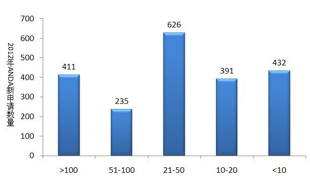 图4显示,2012年新申报的ANDA申请共2095个(按受理号计,不包括辅料)。已有批准文号20个以上的药品,仍有1272个申请,占2012年全年ANDA申报量的60.7%;已有批准文号10个以内的ANDA申请仅占其总申报量的20.6%。此数据显示,仿制药重复研发、重复申报现象依然严重。