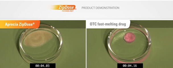 ZipDose技术尤其对那些高剂量的药物有很大优势。比如如果一个药物的有效成分(API)大于1克,按照传统制剂技术很难做成一个药片或胶囊,而如果水溶性低则更难(阿斯利康的Olaparib最初剂型每日要服16个胶囊),而很多中枢神经的药物剂量都很大,对这些药片过大或过多的情况都会给患者或家属造成不便。新型的ZipDose速溶片则可以解决上面的问题。上图左首的是Aprecia生产的ZipDose速溶片,右首是同样药物的传统片剂,可以看出在4秒的时候ZipDose速溶片在水中的扩散程度要明显大于传统的片剂。SPRITAM(左乙拉西坦)只需要一小口水即可溶化,而且不再需要每次量体积,非常方便。SPRITAM(左乙拉西坦)大概要到2016年第1季度才能开始销售。