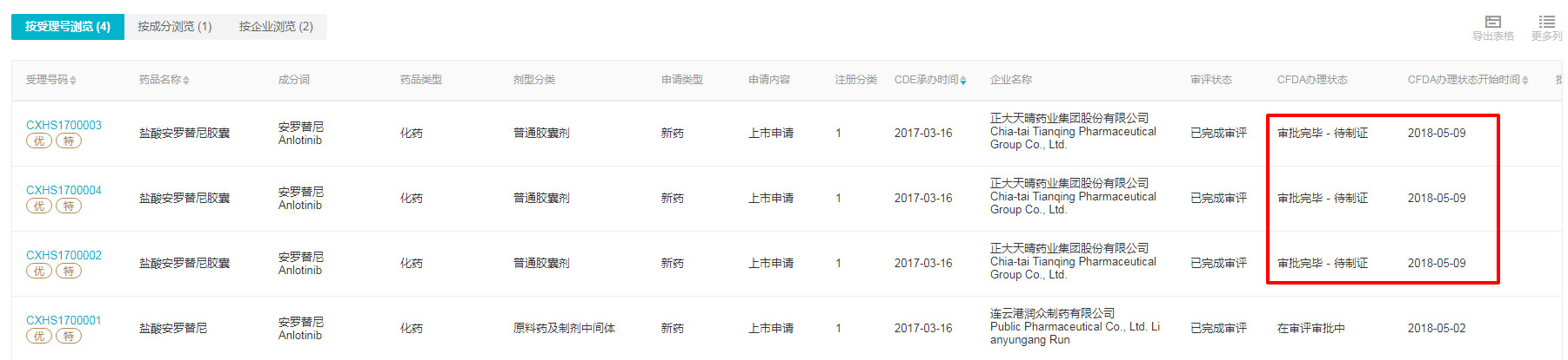 5 月 8 日,Insight 数据库显示,正大天晴 1 类化药新药安罗替尼上市申请的审批状态发生变更,从「在审批」变为「审批完毕-待制证」。
