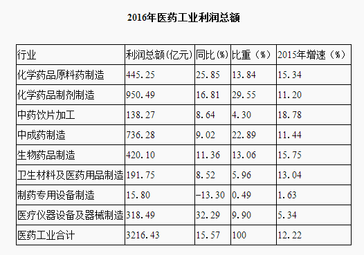 2016年医药工业规模以上企业实现利润总额3216.43亿元,同比增长15.57%,增速较上年同期提高3.35个百分点,高于全国工业整体增速7.07个百分点。各子行业中,增长最快的是化学原料药,制药设备出现负增长。2016年规模以上医药工业主营收入利润率为10.85%,较上年有所提升,高于全国工业整体水平4.88个百分点。