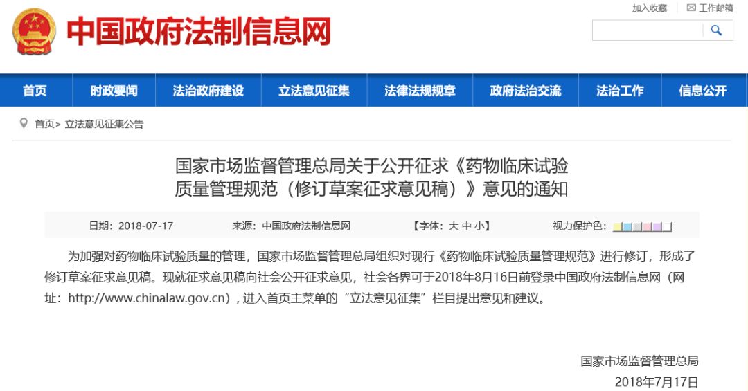 为加强对药物临床试验质量的管理,国家市场监督管理总局组织对现行《药物临床试验质量管理规范》进行修订,形成了修订草案征求意见稿。现就征求意见稿向社会公开征求意见,社会各界可于2018年8月16日前登录中国政府法制信息网(网址:http://www.chinalaw.gov.cn), 进入首页主菜单的“立法意见征集”栏目提出意见和建议。