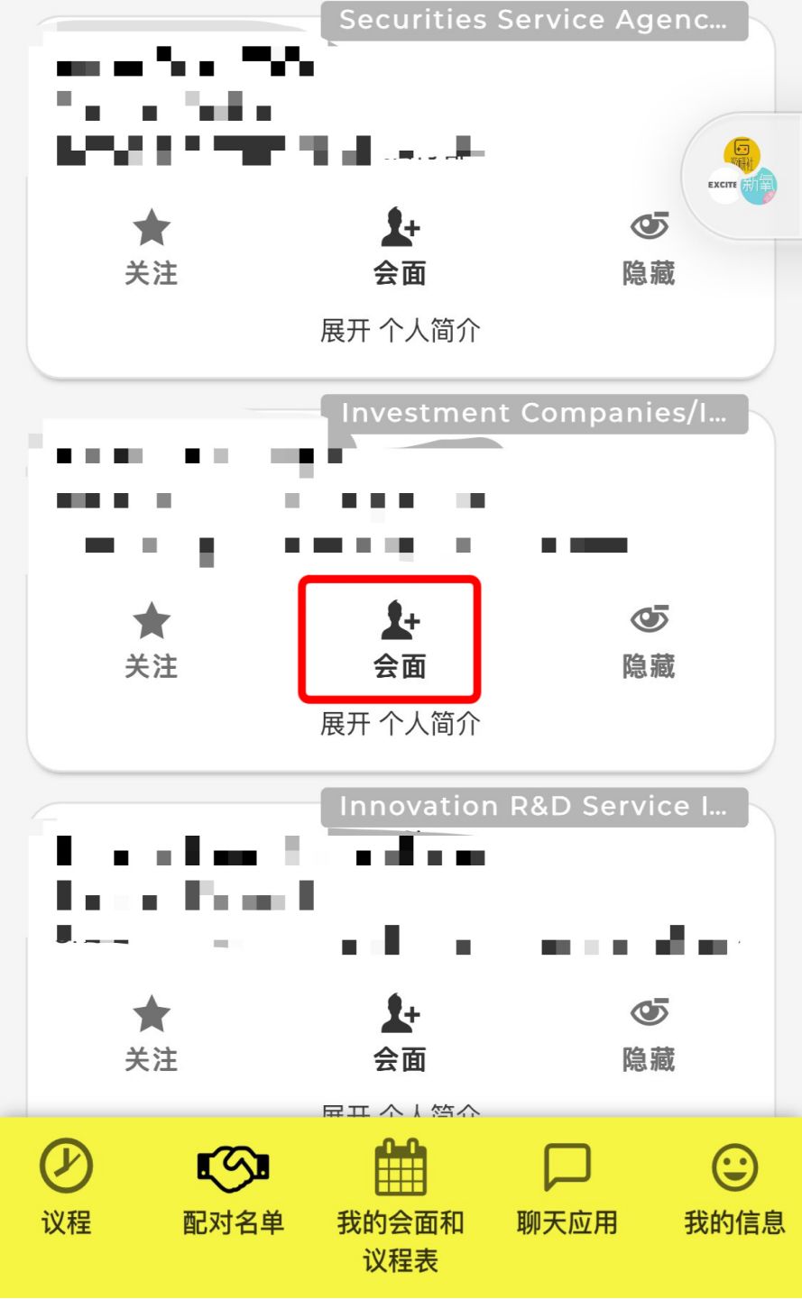 您一旦登录平台,可以看到系统已经把最适合与您会面洽谈的参会者排列在前面。若您对某位参会者有洽谈需求,请点击【会面】按钮,即可向对方发起邀约。