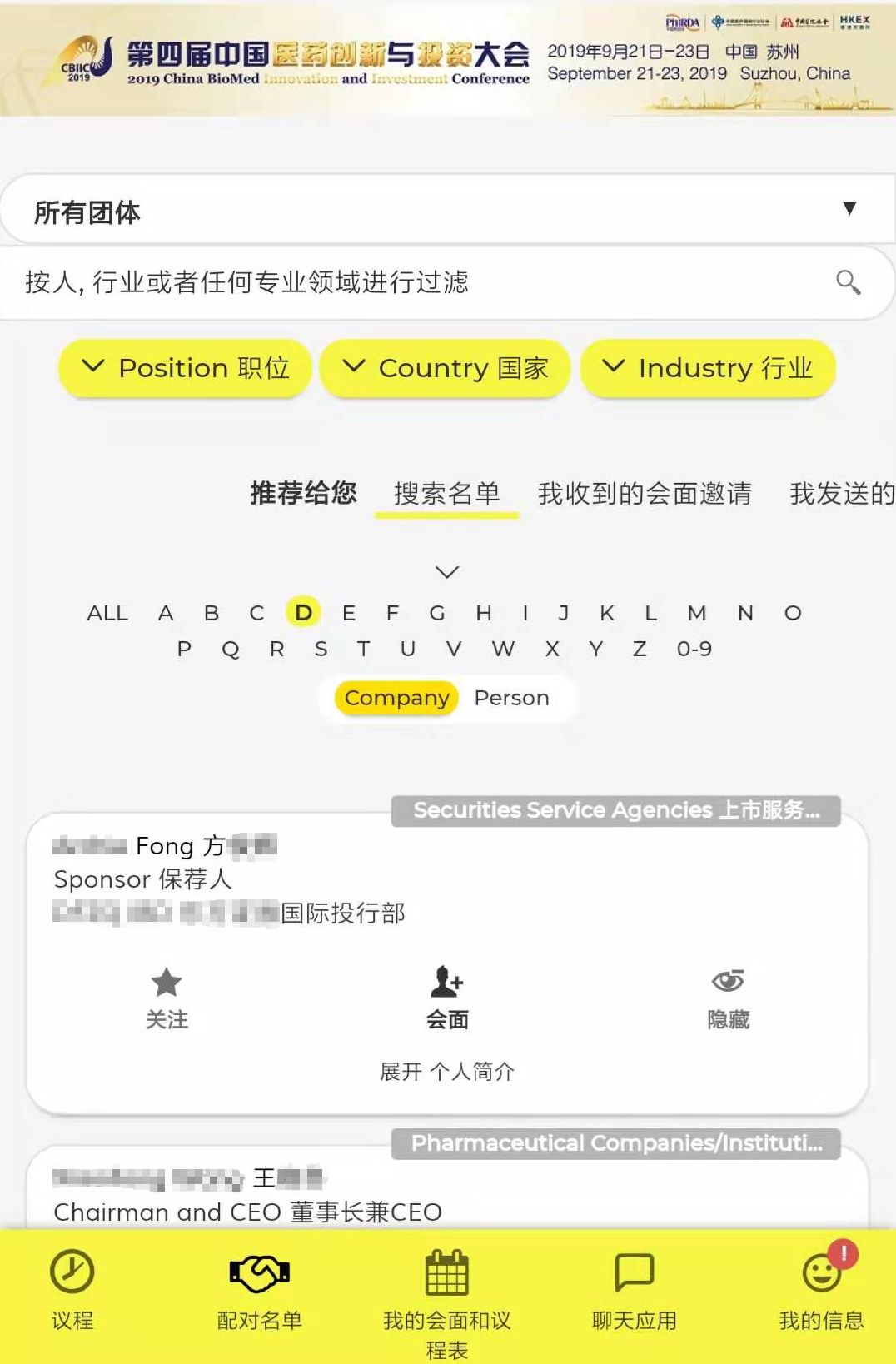 中国医药创新与投资大会(CBIIC)为参会者提供的企业商务洽谈邀约系统于8月21日正式上线了!已报名的嘉宾现在就可通过邀约系统寻找潜在客户或合作伙伴,在线向对方发起邀约,在9月21-23日会议期间可与对方单独面对面交流。本次大会的邀约系统将让参会者获得与意向嘉宾更多的交流机会、实现更多商业价值。