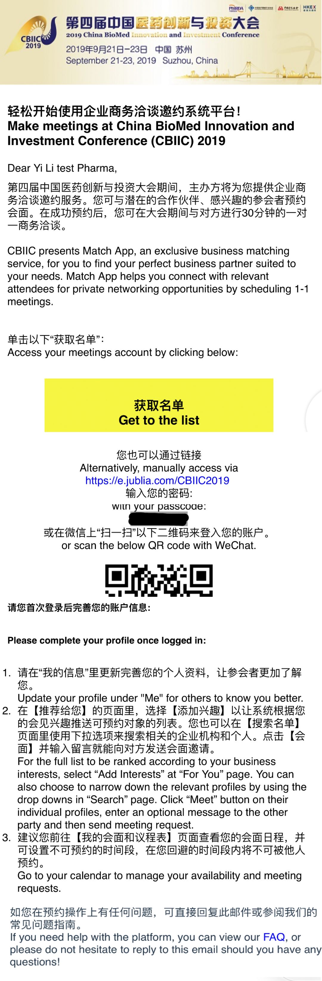 The One-on-One Partnering System presented by 2019 China BioMed Innovation and Investment Conference (2019 CBIIC) is officially online in August 20! Registered attendees can find your perfect business partners suited to your needs by sending meeting requests in the Match App and setting up 1-1 meetings during the 2019 CBIIC in September 21-23. The Match App will bring more communication and commercial opportunities to attendees.
