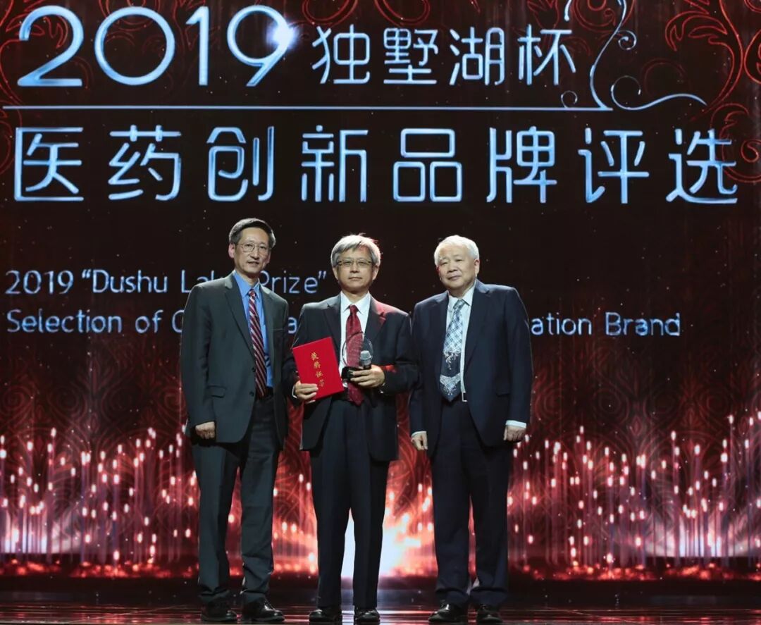 提名奖获奖代表宜昌东阳光长江药业股份有限公司唐新发董事长(正中)与颁奖嘉宾王军志教授(右),揭奖嘉宾任进主任(左)合影