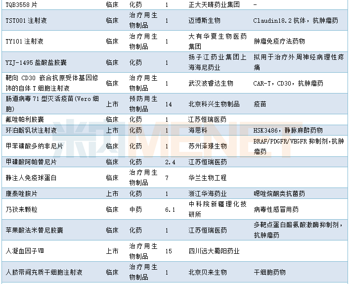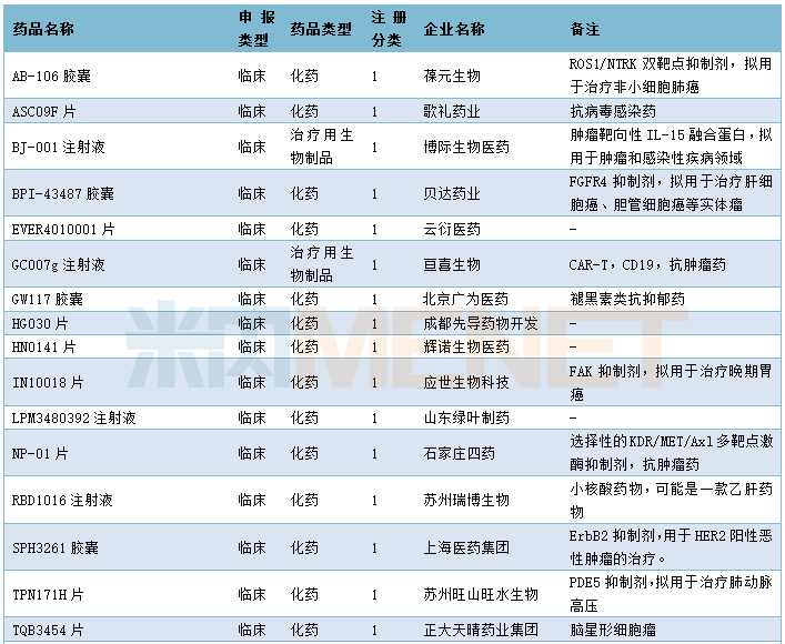 1月有45个药品的新药申请获CDE承办,其中属于1类新药的有34个,2类改良型新药3个,6.1类中药新药2个。详细情况请见下表: