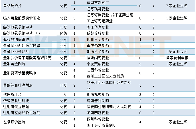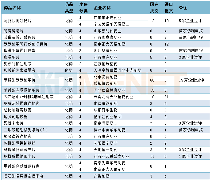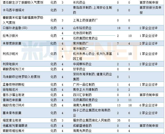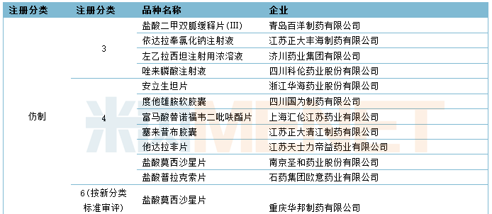 1月CDE共承办57个品种的仿制申请,其中按3类申报的品种有13个,按4类申报的品种有44个,19个品种目前已有企业通过或视同通过一致性评价,8个品种为首家企业提交仿制申请,详细情况请见下表: