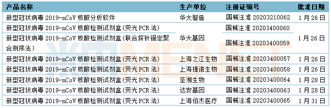 1月有多个仿制药以及一致性评价品种获批。此外,为遏制新型冠状病毒疫情蔓延,国家药品监督管理局根据《医疗器械应急审批程序》应急审批多家企业的新型冠状病毒检测产品,截至1月31日,已有7家企业的新型冠状病毒检测产品获应急审批,具体情况请见下表: