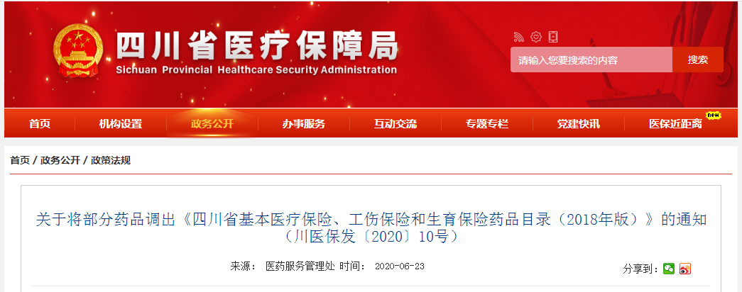 关于将部分药品调出《四川省基本医疗保险、工伤保险和生育保险药品目录(2018年版)》的通知