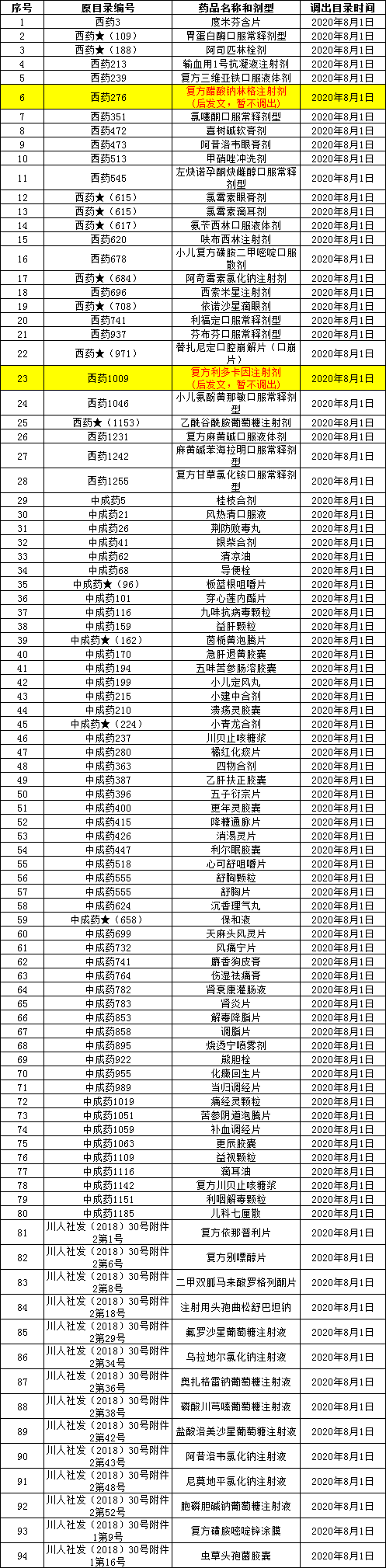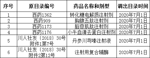 纳入国家重点监控范围的转化糖电解质注射剂等6种药品于2020年7月1日起调出《药品目录》(见附件1)。度米芬含片等94种药品于2020年8月1日起调出《药品目录》(见附件2)。铝镁匹林片(II)等44种药品于2021年8月1日起调出《药品目录》(见附件3)。上述药品调出前,继续按《药品目录》有关规定支付。