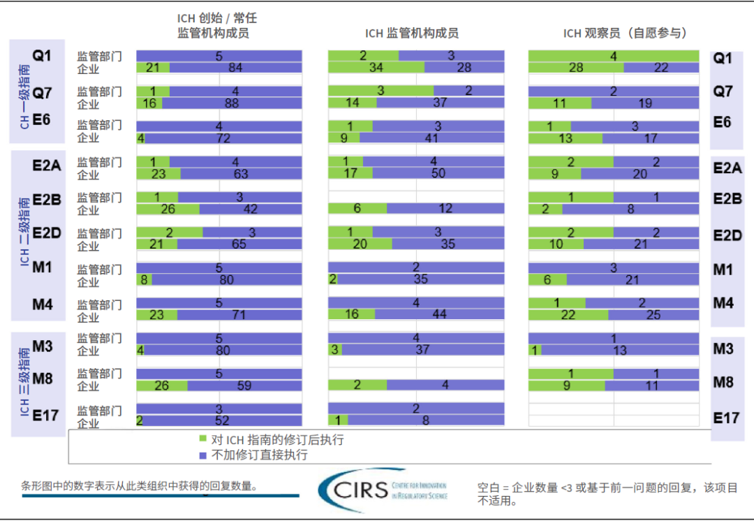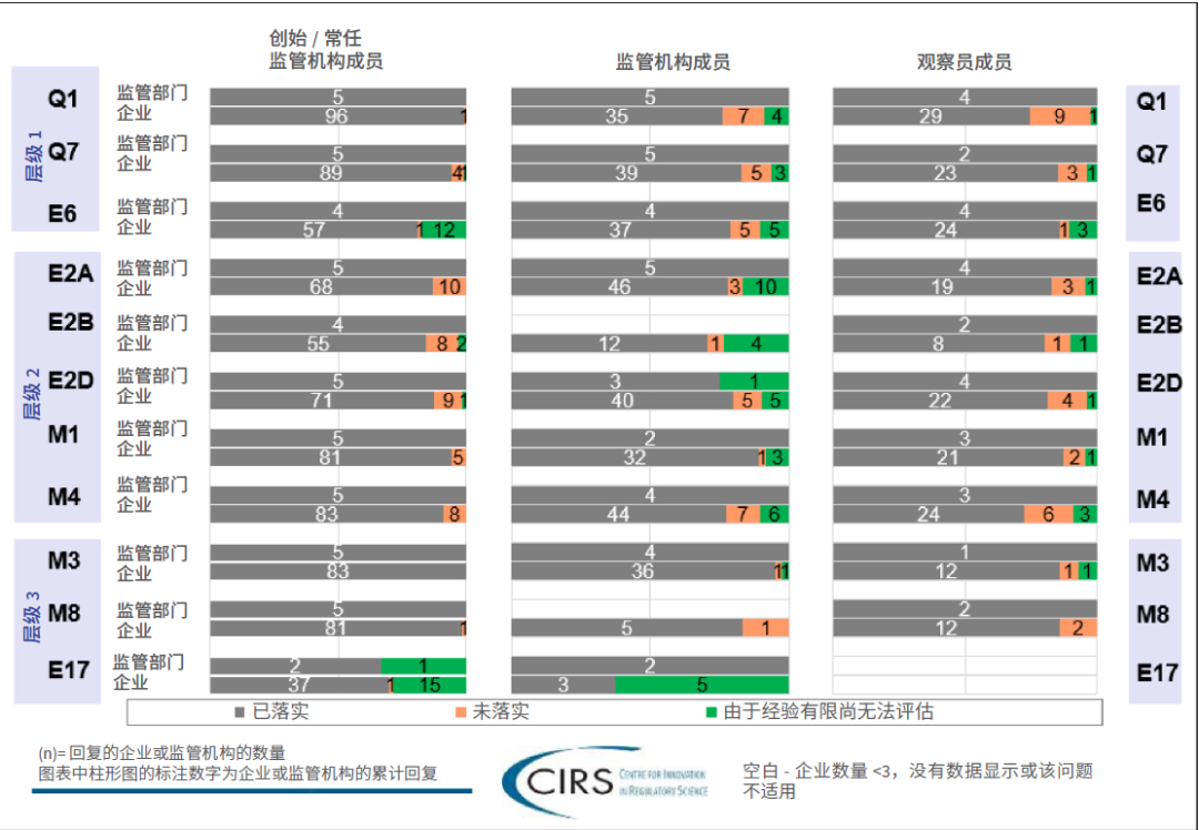- ICH 指南的落实情况:在确认执行的监管机构中,所有监管机构均认为本机构能够落实指南要求,即在日常工作