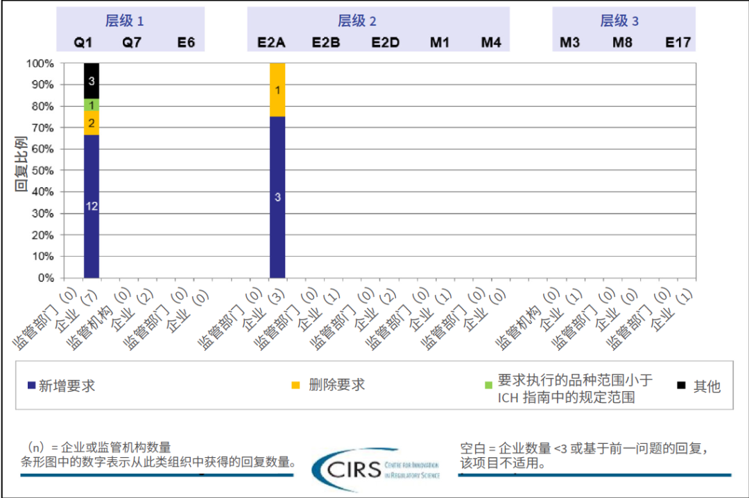 执行情况:请监管机构和企业提出对选定指南执行情况的看法。下图中的第1 个条形表示监管机构的自我评估,第2 个条形表示企业回复的数量。按照ICH 成员类别对监管机构进行汇总分析,按照层级1、2 和3 对指南进行分类。全部15 家参与的监管机构回复汇总见附件3。