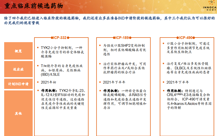 公司专注于肿瘤和自身免疫类疾病治疗领域;截止2020年8月27日,诺诚健华港股目前市值约170亿港元。目前重要的临床前候选药物有:小分子TYK2抑制剂、SHP2变构抑制剂、口服蛋白降解小分子新药等。
