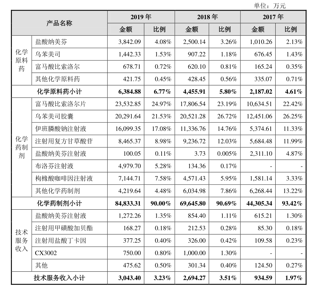 苑东生物成立于2009年,是一家专注于化学原料药和化学药制剂的研发、生产与销售的制药公司。其董事长兼总经理王颖女士合计控制公司58.11%的股权,为苑东生物实际控制人。据招股书披露,2017~2019年,苑东生物营业收入分别为4.76亿元、7.69亿元和9.47亿元,其中仿制药产品销售收入占主营业务收入比例分别为97.39%、96.15%、96.31%。富马酸比索洛尔片、伊班膦酸钠注射液、乌苯美司胶囊、注射用复方甘草酸苷、盐酸纳美芬注射液、枸橼酸咖啡因注射液和布洛芬注射液等7款产品为其核心产品。