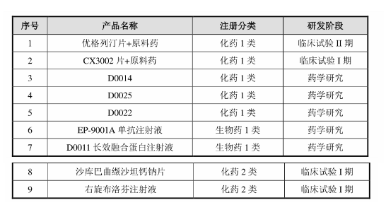 在仿制药领域,苑东生物开始聚焦“原料药+制剂一体化生产“的核心优势。据招股书披露,苑东生物已在富马酸比索洛尔片、依托考昔片等多个化学药制剂产品中实现了对应化学原料药的自主供应,使得其在相关产品的质量全程控制能力、成本控制能力、原料药避免被垄断断供上更具优势。在创新药领域,苑东生物开始积极布局生物制药产品。截至目前,苑东生物共有46款在研产品,其中9款产品已进入申报上市阶段,硫酸氢氯吡格雷片、布洛芬氨丁三醇注射液等在研高端化学药被纳入优先审评;6 款产品处于临床试验阶段,包括已进入II期临床试验阶段的1类化药优格列汀片、处于I期临床试验阶段的1类化药CX3002 片,以及31 款处于药学研究阶段,包括EP-9001A 单抗注射液、D0011 长效融合蛋白注射液 2 款生物1类新药项目。