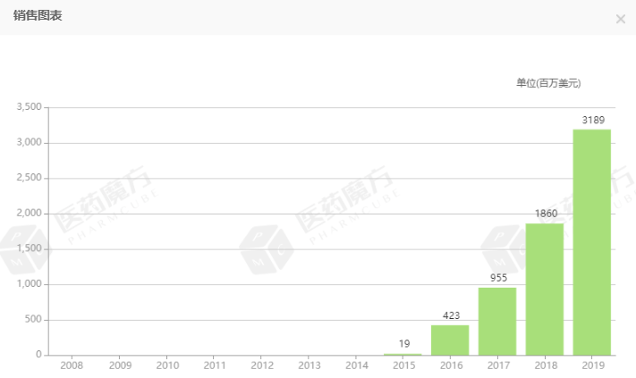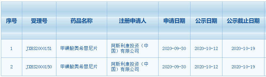 10月12日,阿斯利康在中国提交的甲磺酸奥希替尼片上市申请拟纳入优先审评,用于具有表皮生长因子受体(EGFR)敏感突变的非小细胞肺癌(NSCLC)成人患者肿瘤切除术后的辅助治疗。奥希替尼是不可逆的第三代EGFR酪氨酸激酶抑制剂,可同时抑制EGFR敏感突变和EGFR-T790M耐药突变,与第一代和第二代EGFR-TKIs相比,其穿透血脑屏障的能力更强,对合并中枢神经系统转移的患者具有很好的疗效。奥希替尼于2017年3月在中国首次获批用于往经表皮生长因子受体(EGFR)酪氨酸激酶抑制剂(TKI)治疗时或治疗后出现疾病进展,并且经检测确认存在EGFR T790M突变阳性的局部晚期或转移性非小细胞性肺癌(NSCLC)成人患者。2019年9月3日,甲磺酸奥希替尼片获批用于一线治疗EGFR突变阳性局部晚期或转移性非小细胞肺癌(NSCLC)成人患者。2018年10月,奥希替尼通过医保谈判成功进入医保乙类药品目录, 作为晚期非小细胞肺癌的二线疗法使用,医保支付标准为510元(80mg/片)、 300元(40mg/片),降幅达70%,在中国销量也显著增加。奥希替尼在美国、欧盟、日本陆续获批新适应症并被推荐为一线标准治疗方案后,销售表现强劲,2018全年销售收入达到18.6亿美元,占阿斯利康肿瘤业务收入的约31%,2019年更是升至31.89亿美元,中国市场业绩也在逐步攀升。ESMO2020大会上公布的III期ADAURA研究数据显示,奥希替尼在对接受过完全肿瘤切除术的早期(IB、II和IIIA期)EGFRm NSCLC患者的辅助治疗中,可带来具有临床意义的中枢神经系统(CNS)无病生存期(DFS)改善。奥希替尼辅助治疗组较安慰剂组有更少患者出现了复发或死亡 (11% vs. 46%)。在已出现疾病复发的患者中,奥希替尼组中有38%的患者出现了转移性复发,而安慰剂组为61%。奥希替尼可显著降低中枢神经系统复发或死亡风险82%(HR 0.18)。两组均未达到中位中枢神经系统无病生存期 (CNS DFS)。此外,一项事后分析提示,在既往未出现其他部位复发的患者中,接受奥希替尼治疗的患者18个月时出现脑部疾病复发的估算几率低于1%,而安慰剂组为9%。主要研究终点-II期和IIIA期患者的无病生存期,奥希替尼辅助治疗降低了83%疾病复发或死亡的风险(HR 0.17)。