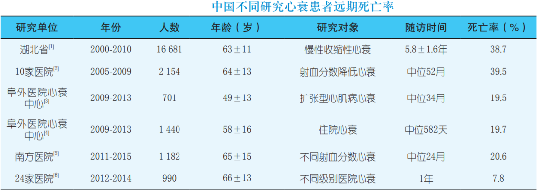 2019年,《柳叶刀》上发表的一项研究显示,在对中国居民1990年-2017年死亡原因进行分析后发现,死亡率第一的是卒中,紧随其后的是缺血性心脏病,第三才是肺癌。2020年9月底公布的《中国心血管病健康和疾病报告2019》显示,中国每年心源性猝死者高达55万,中国心血管病现患人数达到3.30亿,心力衰竭890万。另外,据统计2014年全球约有2600万心衰患者。心衰是各种心脏疾病的严重表现或晚期阶段,死亡率和再住院率居高不下。中国心衰患者的住院病死率为4.1%,急性心衰患者急诊死亡率为9.6%,国内对慢性心力衰竭患者远期死亡率的研究数据如下表所示。