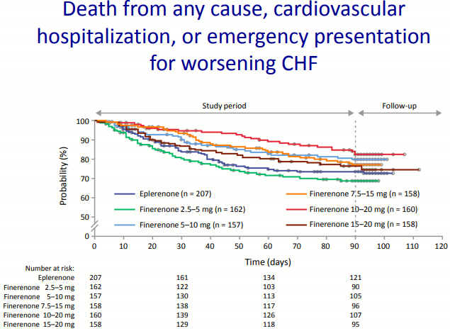 与依普利酮组相比,finerenone各剂量组(除最低剂量)患者的次要终点(全因死亡、心血管相关入院或因慢性心衰恶化紧急就诊)发生率均较低。Finerenone起始剂量10 mg组患者风险降低幅度最大(HR = 0.56,P = .0157)。finerenone组个体次要终点(全因死亡、心血管死亡及心血管入院)较依普利酮组有所降低,但不显著。
