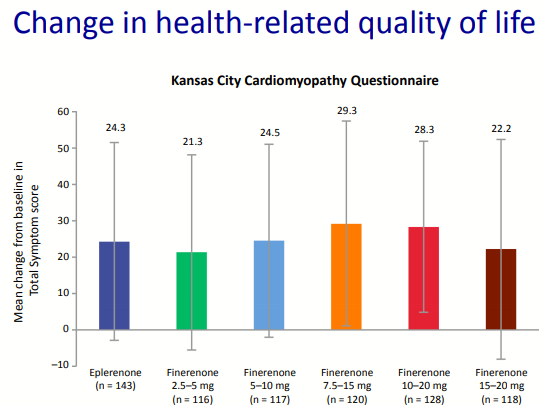 受试者对各剂量finerenone均耐受,且finerenone与依普利酮组治疗相关紧急不良事件发生率相似。依普利酮组患者血钾基线至90天平均变化为0.262 mmol/L,而finerenone各组血钾平均变化在0.119 mmol/L~0.202 mmol/L之间。两种治疗均与血钾升高≥5.6 mmol/L(依普利酮4.7% vs. 4.3% finerenone)及eGFR>40%(依普利酮 9.4%vs. 9.1% finerenone)有关。