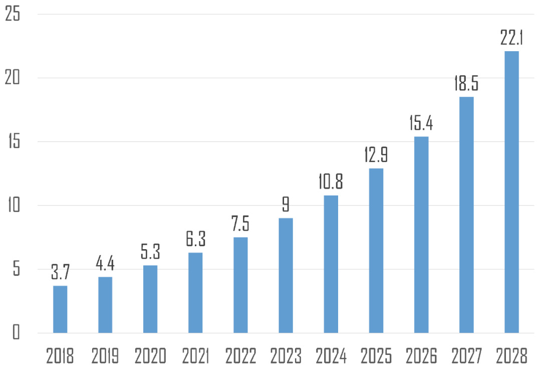 Globlaldata报告显示,2018年全球心衰治疗药物市场规模为37亿美元,由于全球人口老龄化,慢性心衰的患病率不断上升,糖尿病等共病患病率的增加,以及心肌梗死后治疗和生存率的提高。在HF的诊断方面的进步和预防方面未得到满足的需求,心衰的诊断率和就诊率不断提升,加之新靶点、新机制的药品不断上市,到2028年GAGR将保持在19.5%达到221亿美元,如下图所示(单位:十亿美元)。