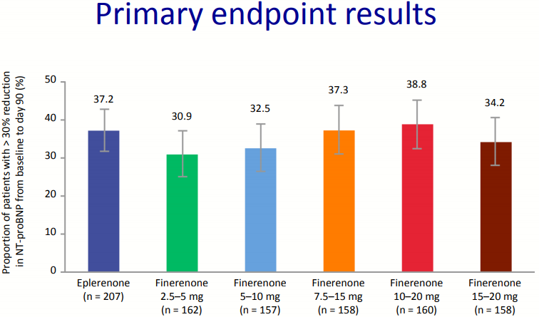 目前,finerenone心衰适应症的III期临床试验正在进行中,预计将于2021年结束。finerenone心衰II期临床——ARTS-HF,比较了口服finerenone与依普利酮在治疗心衰恶化、2型糖尿病和/或慢性肾病患者时的安全有效性。90天时两组患者主要终点(NT-proBNP降低30%以上)发生率相似。