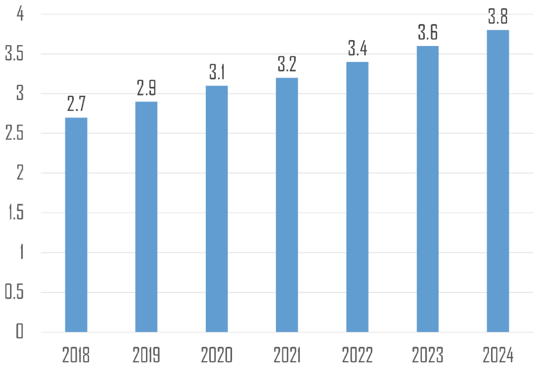 慢性HFrEF 患者的治疗方式有药物治疗和心脏植入型电子器械治疗,慢性HFpEF 和HFmrEF的主要治疗方式为药物治疗,急性心衰可适用药物治疗和非药物治疗,非药物治疗可选择主动脉内球囊反搏、机械通气、肾脏替代治、机械循环辅助治疗等治疗手段。糖尿病肾脏疾病(DKD,diabetickidney disease)旧称糖尿病肾病(diabetic nephropathy, DN),是指由糖尿病所致的慢性肾脏疾病(CKD),通常是根据尿白蛋白升高和(或)预估肾小球滤过率下降、同时排除其他CKD 而作出的临床诊断。DKD 是糖尿病常见的慢性并发症,是终末期肾病的重要病因。据国际糖尿病联盟统计,2019年全球约4.63亿20-79岁成人患糖尿病(11个人中有1个为糖尿病患者);预计到2030年,糖尿病患者会达到5.784亿;预计到2045年,糖尿病患者会达到7.002亿。2020年5月,滕卫平等报道中国成人糖尿病患病率约12.8%,糖尿病前期比例35.2%,我国糖尿病患者总数约为1.3亿。根据《中国心血管健康与疾病报告2019》数据统计,按照中国大陆约有10.9亿的成年人计算,有3.88亿成人是糖尿病前期,低于2010年的4.93亿。总体上,中国有47%的成人患糖尿病或是糖尿病前期,稍低于美国的49%-52%。国外报道20%~40%的糖尿病患者合并DKD,文献报道国内2型糖尿病患者DKD 患病率为10%~40%,但我国尚缺乏全国性DKD 流行病学调查资料。Kenneth Research报告显示,2018年全球糖尿病肾病治疗药物市场规模为27亿美元,到2024年GAGR将保持在5.9%达到38亿美元,如下图所示(单位:十亿美元)。