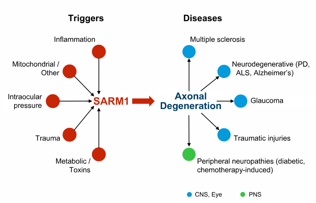 轴突变性(axonal degeneration)是在广泛神经系统疾病中常见的但尚未解决的病理现象,它可引起严重的感觉、运动和认知症状。Disarm的科学创始人,位于圣路易斯的华盛顿大学(Washington University in St Louis)医学院的Jeffrey Milbrandt博士和Aaron DiAntonio博士发现,SARM1蛋白是轴突变性的核心驱动因素。Disarm的SARM1抑制剂旨在直接阻止轴突的丢失。