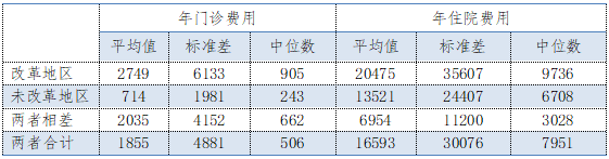 上述分析结果表明,与未改革地区相比,改革地区职工医保患者就诊行为发生了逆转,即门诊利用率相对较高,住院率相对降低。就诊行为的转变必然导致医疗资源配置(医疗费用)发生变化。