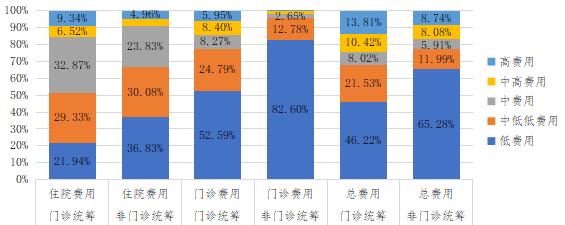 为进一步分析费用差异,我们将职工医保患者年住院费用按费用高低划分为以下五组:低费用组[0-0.5万元]、中低费用组[0.5-1万元]、中费用组[1-3万元]、中高费用组[3-5万元]、高费用组[5万元以上]。将职工医保患者年门诊费用和年就诊总费用(包括门诊费用和住院费用)按费用高低划分为以下五组:中低费用组[0-0.1万元]、中低费用组[0.1-0.3万元]、中费用组[0.3-0.5万元]、中高费用组[0.5-1万元]、高费用组[1万元以上]。图2结果显示: