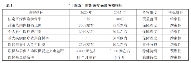 中共中央、国务院《关于深化医疗保障制度改革的意见》明确了我国医疗保障制度在“十四五”“十五五”期间的目标任务。据此可以确定,“十四五”应当是朝着制度统一、运行规范、稳健持续的方向稳步发展并走向定型、完善的关键时期,其主要发展目标是基本建成真正覆盖全民、权责关系清晰、体系结构合理、运行机制高效、预期清晰稳定的中国特色医疗保障制度,实现人人享有基本医疗保障与医保治理现代化,不断增进人民的健康福祉。