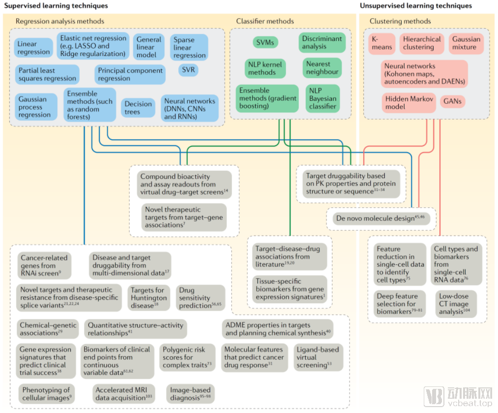 监督学习和非监督学习算法总结及其应用,来源:Nature Review Drug Discovery