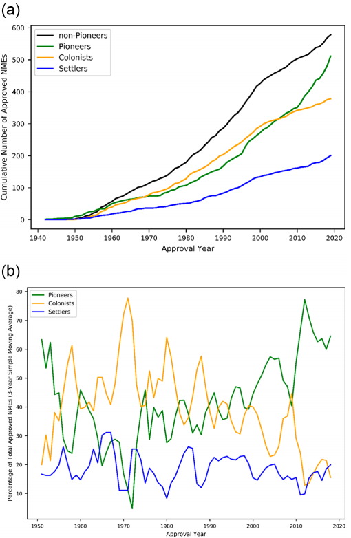 作者认为,尽管外界对人们对创新危机不乏担忧,但在过去的几十年里,药物开发创新已经显著增强,认定首创药物(pioneers)更有可能成为有前途的新疗法的来源。所谓的首创药物(pioneers),指的是形状与骨架从未在FDA之前批准的药物中出现的分子。对结构创新的基本来源的分析表明,在临床研究用新药申请(IND)前5年或更短的时间内,首次在化学物质数据库(CAS REGISTRY)中报道的骨架;或在IND时,有50个或更少的化合物填充的骨架上,往往成为首创药物的主要来源。