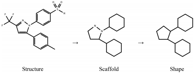 这是在骨架(scaffold)与形状(shape)两个细节层面上完成的。前者是将结构中所有的无环侧链修剪之后剩余的结构,后者是将所有剩下的原子返回到只是普通的碳原子后的骨架。大多数被批准的药物都有某种类型的环状结构。作者确定了1938年以来FDA批准的1089个新分子实体(NMEs)的集合。将这些化合物的结构归结到三类结构中的一类。“首创药物”(pioneers)是指从未在NME中使用过相关形状与骨架的化合物。“定居者”(settlers)是指那些总体形状已被使用,但不包括特定骨架的化合物(因此将允许氮分子之类的移动)。而“殖民者”(colonists)则指形状与骨架已被使用的化合物,只是在侧链上有所区别。
