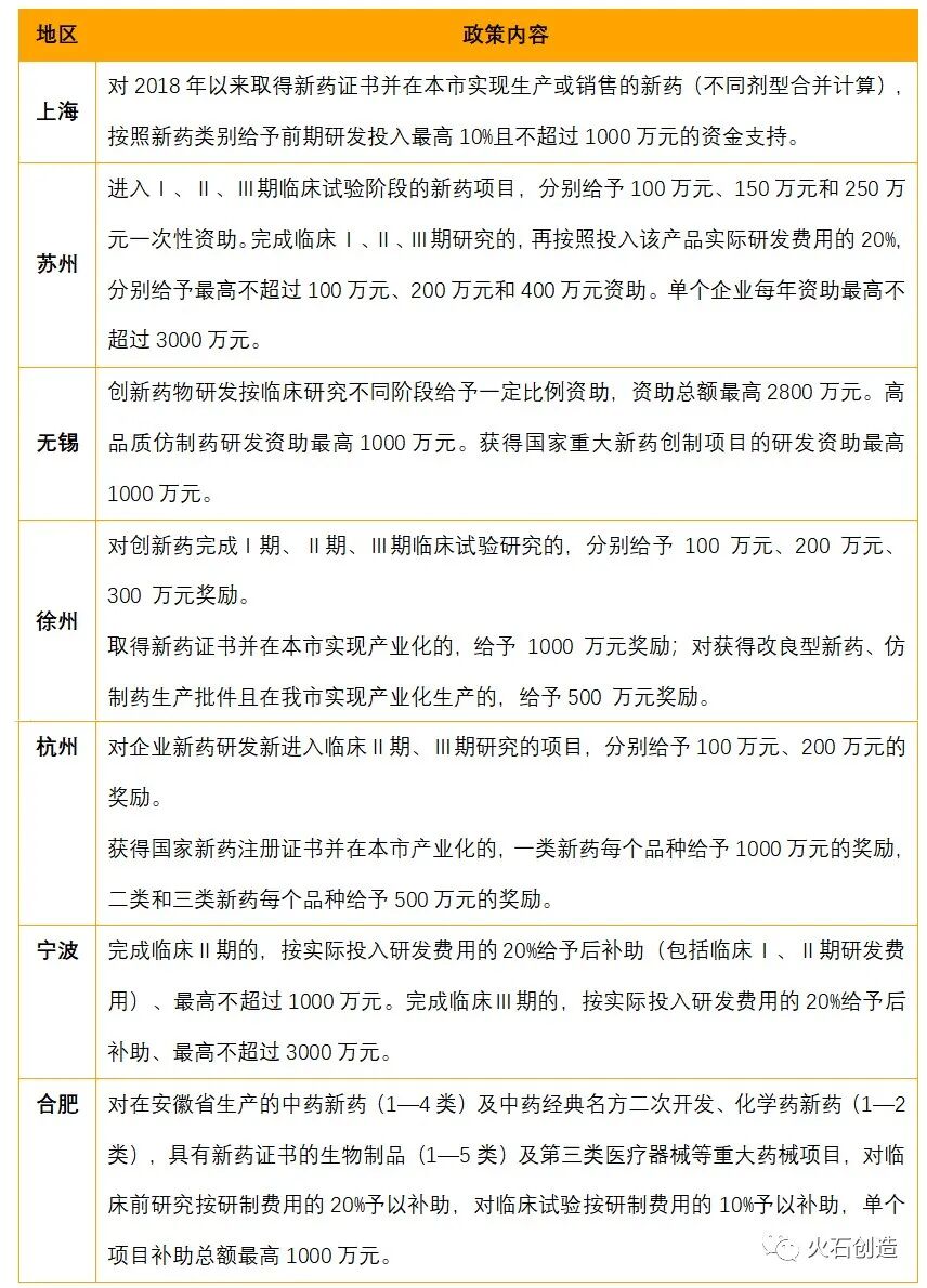 二是对完成Ⅰ、Ⅱ、Ⅲ期临床试验阶段的新药项目,给予1000-3000万元的研发费用补助支持。其中,宁波的扶持限额最高,对完成临床Ⅱ期的,按实际投入研发费用的20%给予后补助(包括临床Ⅰ、Ⅱ期研发费用)、最高不超过1000万元;完成临床Ⅲ期的,按实际投入研发费用的20%给予后补助、最高不超过3000万元;