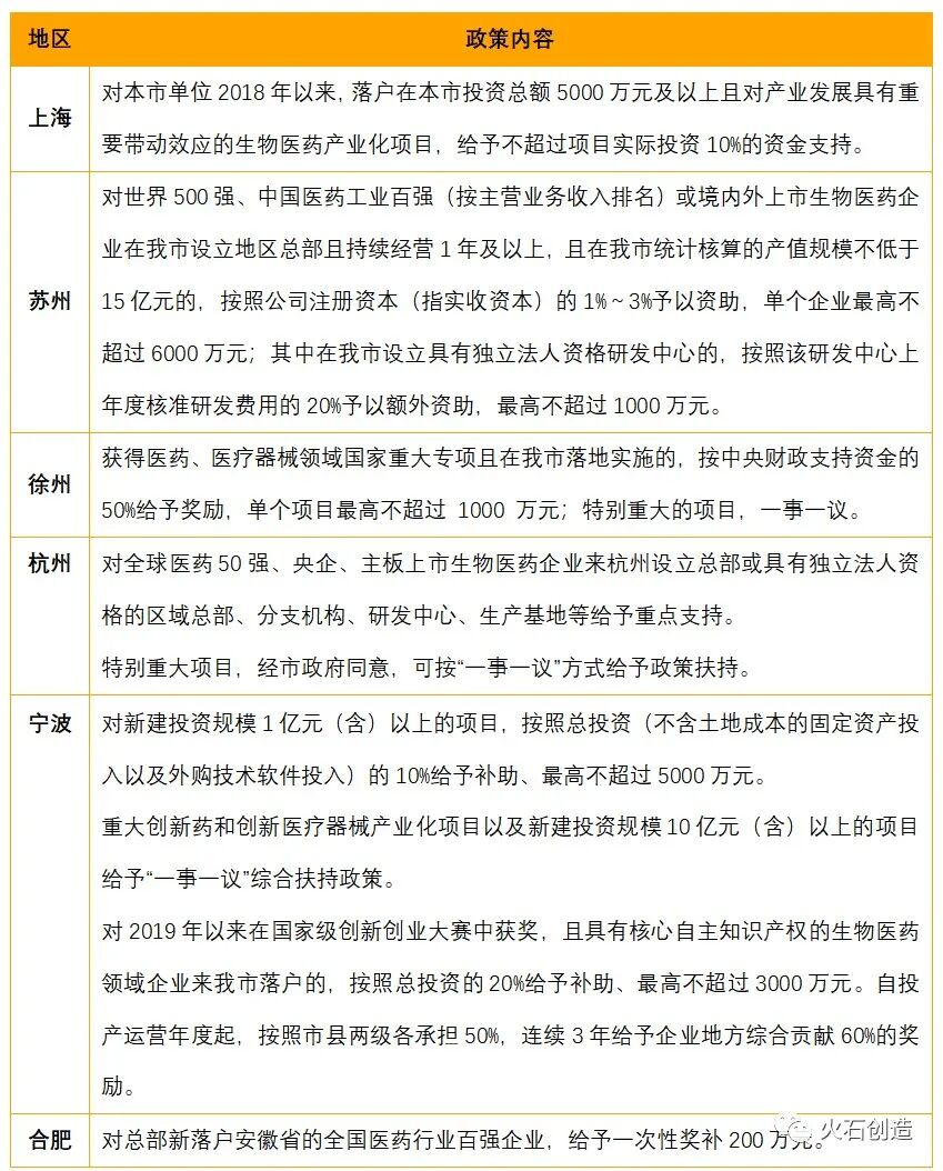对产业重点发展领域,引入产业特别重大项目,引入世界500强、中国医药工业百强、上市公司等重点企业及国家重大专项,给与项目投资补贴,或者一事一议的政策。上海市重点鼓励投资总额5000万元及以上且对产业发展具有重要带动效应的生物医药产业化项目;宁波市对新建投资规模1亿元(含)以上的项目、重大创新药和创新医疗器械产业化项目及在国家级创新创业大赛中获奖项目给予不同的补贴力度。