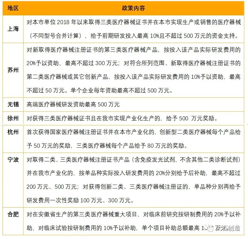对获批二三类医疗器械按10%-20%研发投入给予补贴,其中安徽省合肥市政策力度最大,对第三类医疗器械重大项目,对临床前研究按研制费用的20%予以补助,对临床试验按研制费用的10%予以补助,单个项目补助总额最高1000万元。