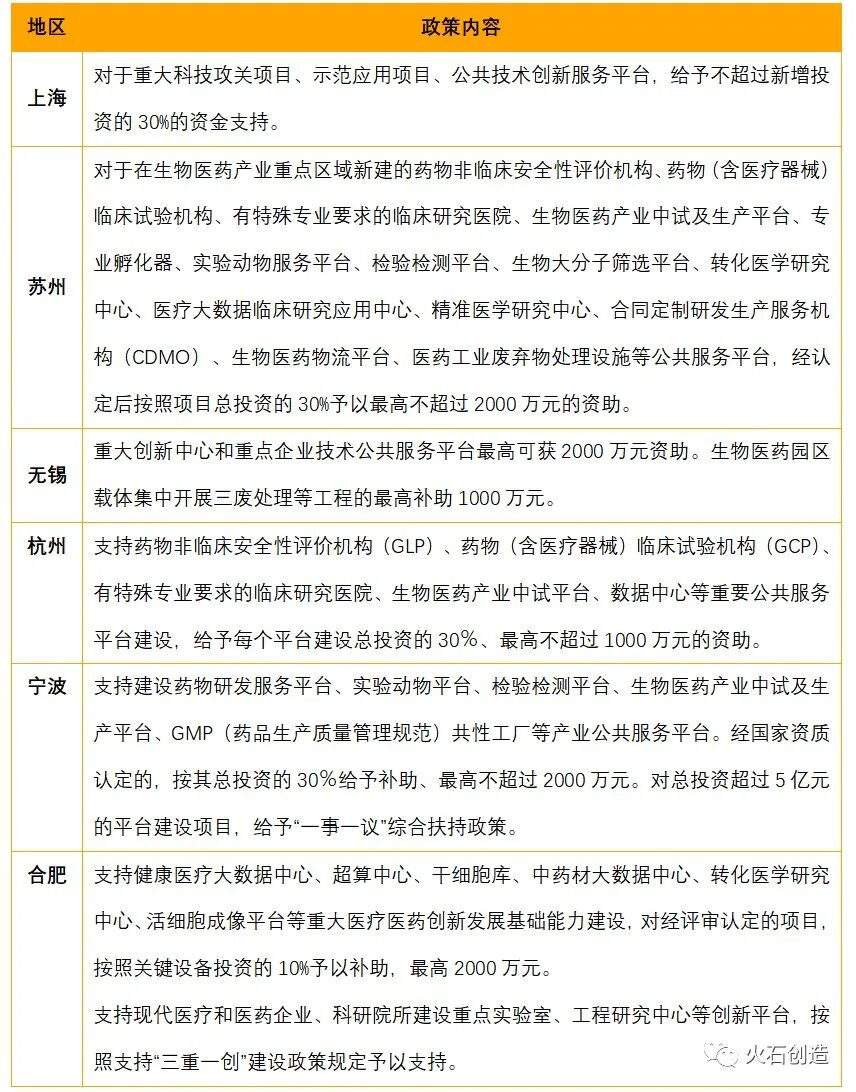 主要是对药物非临床安全性评价机构、药物(含医疗器械)临床试验机构、有特殊专业要求的临床研究医院、生物医药产业中试及生产平台、专业孵化器、实验动物服务平台、生物医药物流平台、医药工业废弃物处理设施等重要公共服务平台建设,通过平台建设投资补贴及关键设备投资补助等方式,一般给予不超过投资总额30%的资金支持。苏州、无锡、宁波等地扶持力度最大,给予项目最高不超过2000万元的资助。合肥市对经评审认定的项目,按照关键设备投资的10%予以补助,最高2000万元。