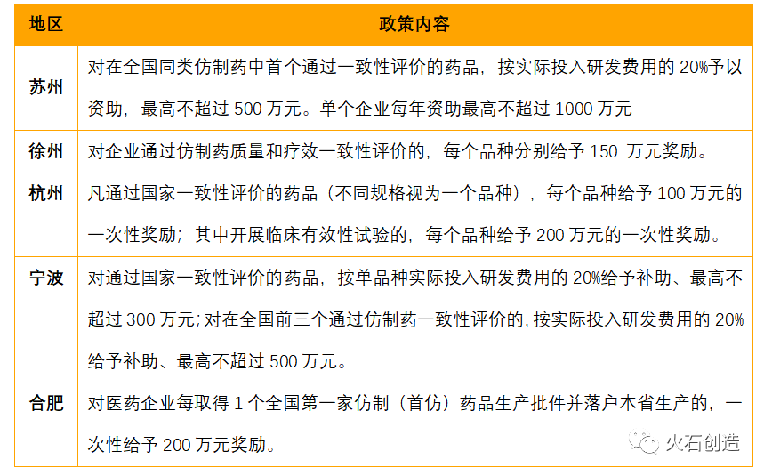 对于企业通过一致性评价一般给予实际投入研发费用的20%、最高不超过500万元的资金扶持。其中,宁波扶持力度较大、覆盖范围广,对通过国家一致性评价的药品,按单品种实际投入研发费用的20%给予补助、最高不超过300万元,对在全国前三个通过仿制药一致性评价的,按实际投入研发费用的20%给予补助、最高不超过500万元。