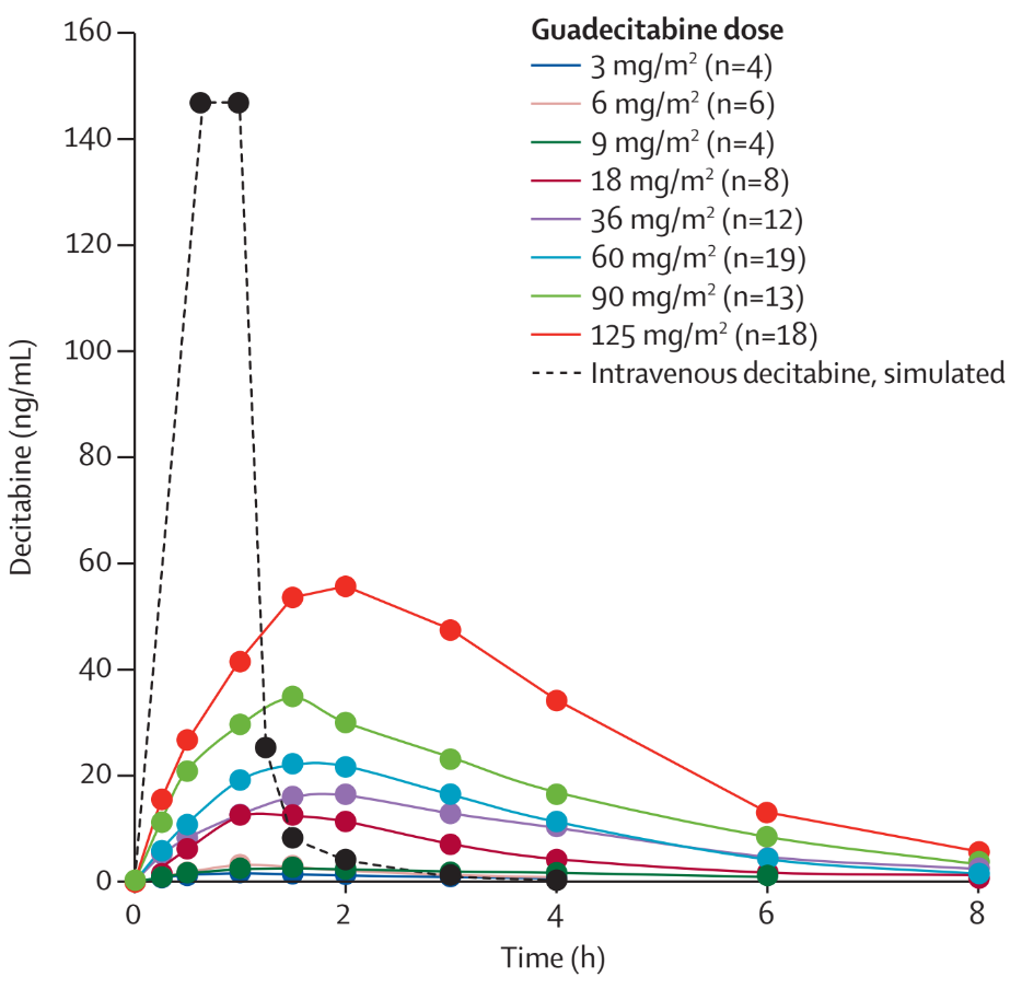 Guadecitabine是新一代DNA去甲基化药物,能够抵抗胞苷脱氨酶的降解,半衰期和药物暴露优于直接注射地西他滨