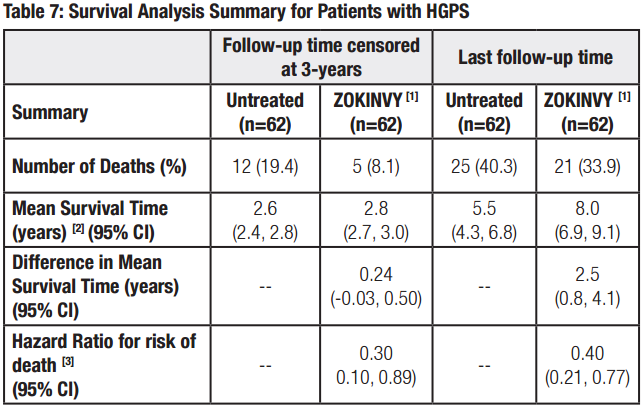 Zokinvy的疗效在一项观察性队列生存研究中得到证实。该研究回顾性地比较了接受Zokinvy治疗和未接受治疗患者的生存数据。为期3年的随访结果显示,接受Zokinvy治疗HGPS患者的平均寿命延长了3个月,为期11年的随访结果显示,接受Zokinvy治疗HGPS患者的平均寿命延长了2.5年。常见的不良反应是胃肠道反应(呕吐、腹泻、恶心),大多数为轻度或中度(1级或2级)。许多早衰症患者接受Zokinvy连续治疗超过10年。