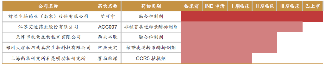 我国抗HIV创新药物较为稀缺,目前国内在研管线产品大多处于临床早期,具有较大的不确定性。国内自主研发的具有全新分子实体的抗艾滋病新药仅有前沿生物的艾可宁获批上市;此外,艾迪药业、扶素生物、真实生物等也在艾滋病治疗领域进行布局(表4)。