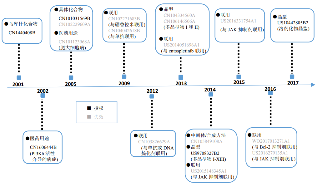 全球已获批上市的化药的专利布局。以艾德拉尼为例,ICOS Corporation和Gilead Calistoga LLC已布局了化合物、晶型、医药用途、中间体/合成方法、联合用药等专利,具体专利布局如下(数据说明:同族专利按照CN>US >WO和授权>失效的顺序选取)。
