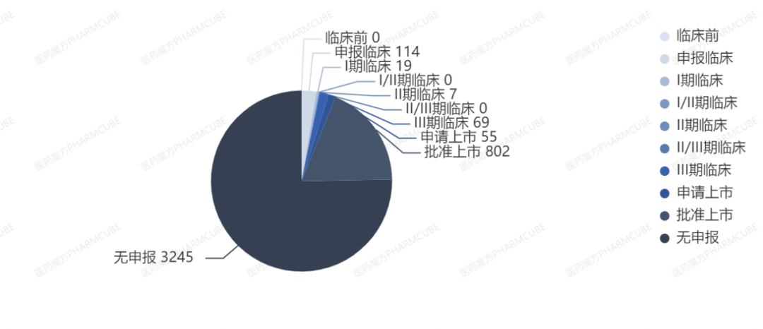 根据医药魔方NextPharma数据库,截至2020年11月25日,全球已获批上市的化学药品共有4300多种,在中国的研发阶段如下图所示。其中只有802个化学药品在国内批准上市,55个化学药品申请上市,114个化学药品申报临床,95个化学药品处于临床研究阶段,3245个化学药品在国内无申报。其中国内无申报中不乏一些5年内中国化合物专利即将到期的化学药品,如艾德拉尼(idelalisib)、鲁卡帕尼(rucaparib)、匹莫范色林(pimavanserin)等,还包括一些美国化合物专利尚未到期但国内无化合物专利的化学药品,如奥贝胆酸(obeticholic acid)、替洛利生(pitolisant)。