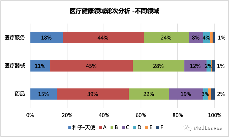 从不同领域分析,药品领域的融资轮次相对靠后,D轮的占比达到将近20%,然而医疗器械和医疗服务的融资轮次相对靠前,说明药品领域发展进程略快于医疗器械和医疗服务,相对发展比较完善。